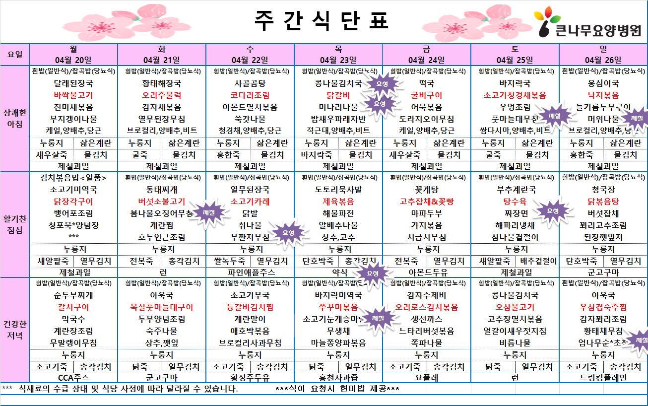 큰나무 암요양병원의 2026년 4월 4주차 식단표를 살펴보도록 하겠습니다.