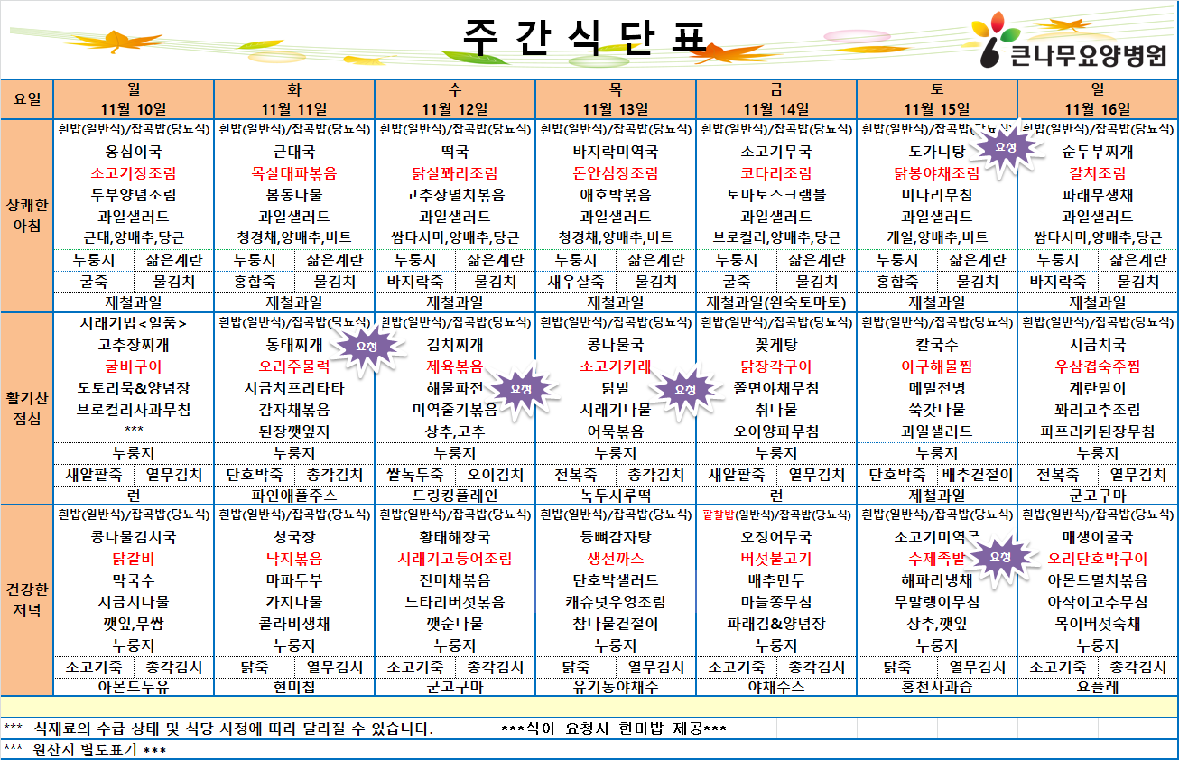 큰나무 암요양병원의 2025년 11월 2주차 식단표를 살펴보도록 하겠습니다.
