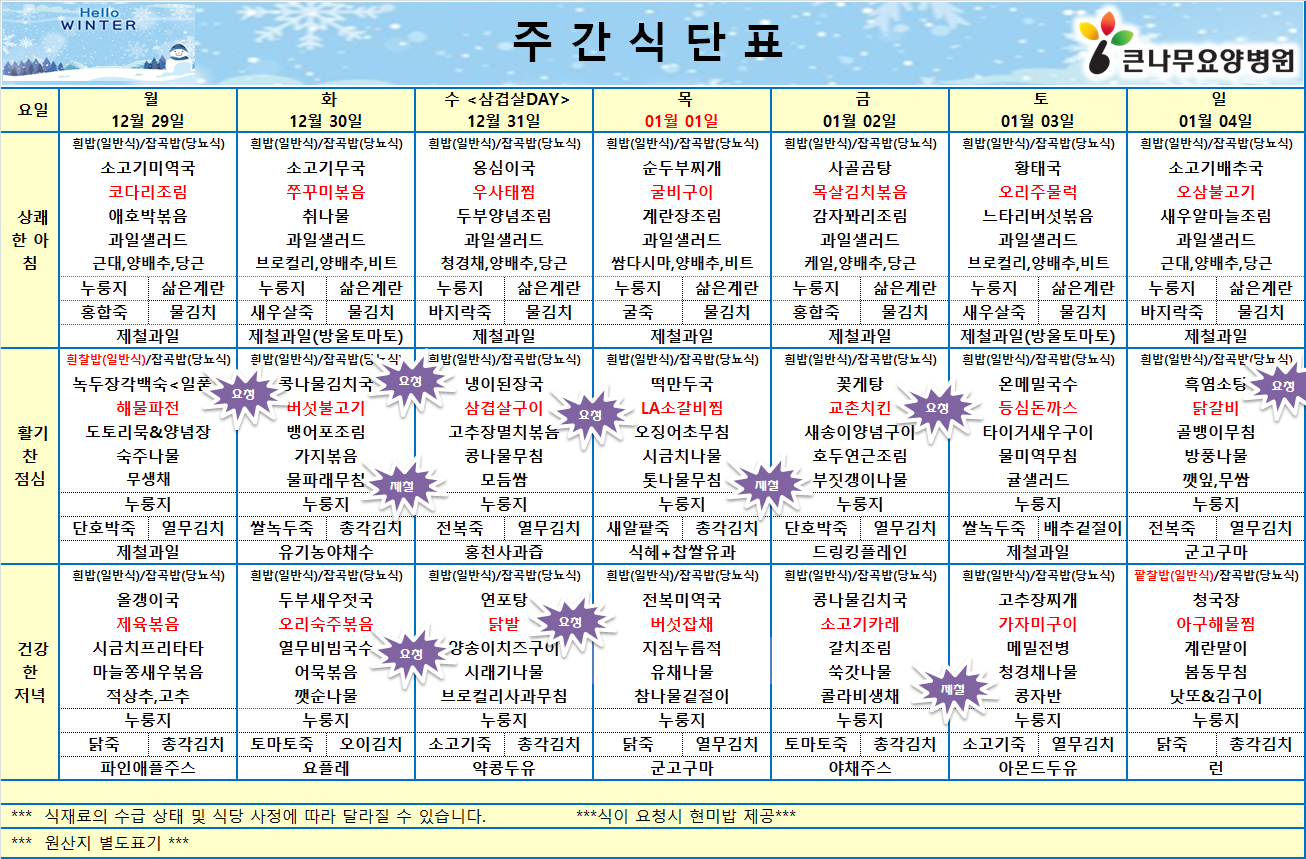 큰나무 암요양병원의 2025년 12월 5주차 식단표를 살펴보도록 하겠습니다.